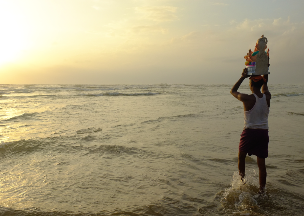 Every year there are Millions of Ganesha Statues immersed into the ocean. But why into the sea? Generally Hindus worship the formless, but in order to reach out to a wider audience the formlessness is given form by making Ganesha Idols of clay and water. These formless forms are then offered to the sea the primordial element – water. The formlessness giving way to form and then moving again towards formlessness.