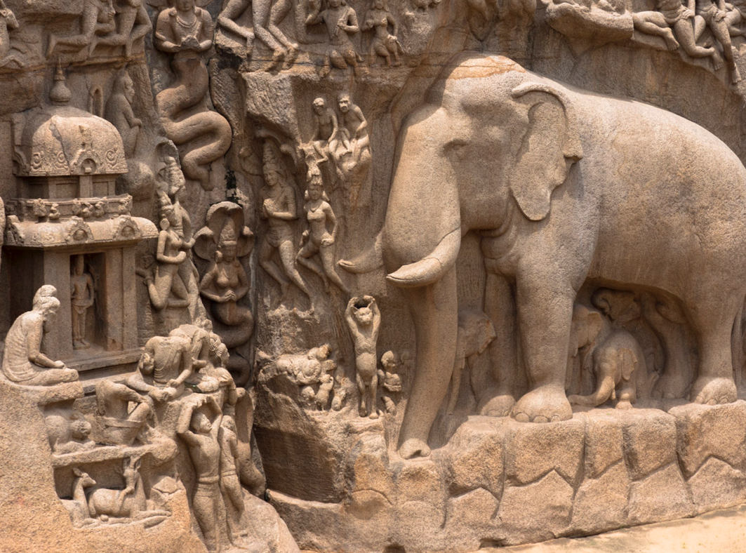 Our journey starts at Mamallapuram, a small and town right by the bay of Bengal. The are sandy beaches where you can wiggle your toes into the sand and take a swim and inhale the fresh smell of the sea. What better place to start a tour? The small coastal city has however more to offer. There are remnants of temples and kingdoms hewn out of granite rocks reflecting the wealth and riches of centuries of culture and trade. Here you will stand in front of the massive granite relief, depicting the arrival of the Ganges. One of the oldest mythological stories where the Goddess Ganges (the river) brings wealth to a rain starved land. Its a tribute to water, the nourisher of all things.