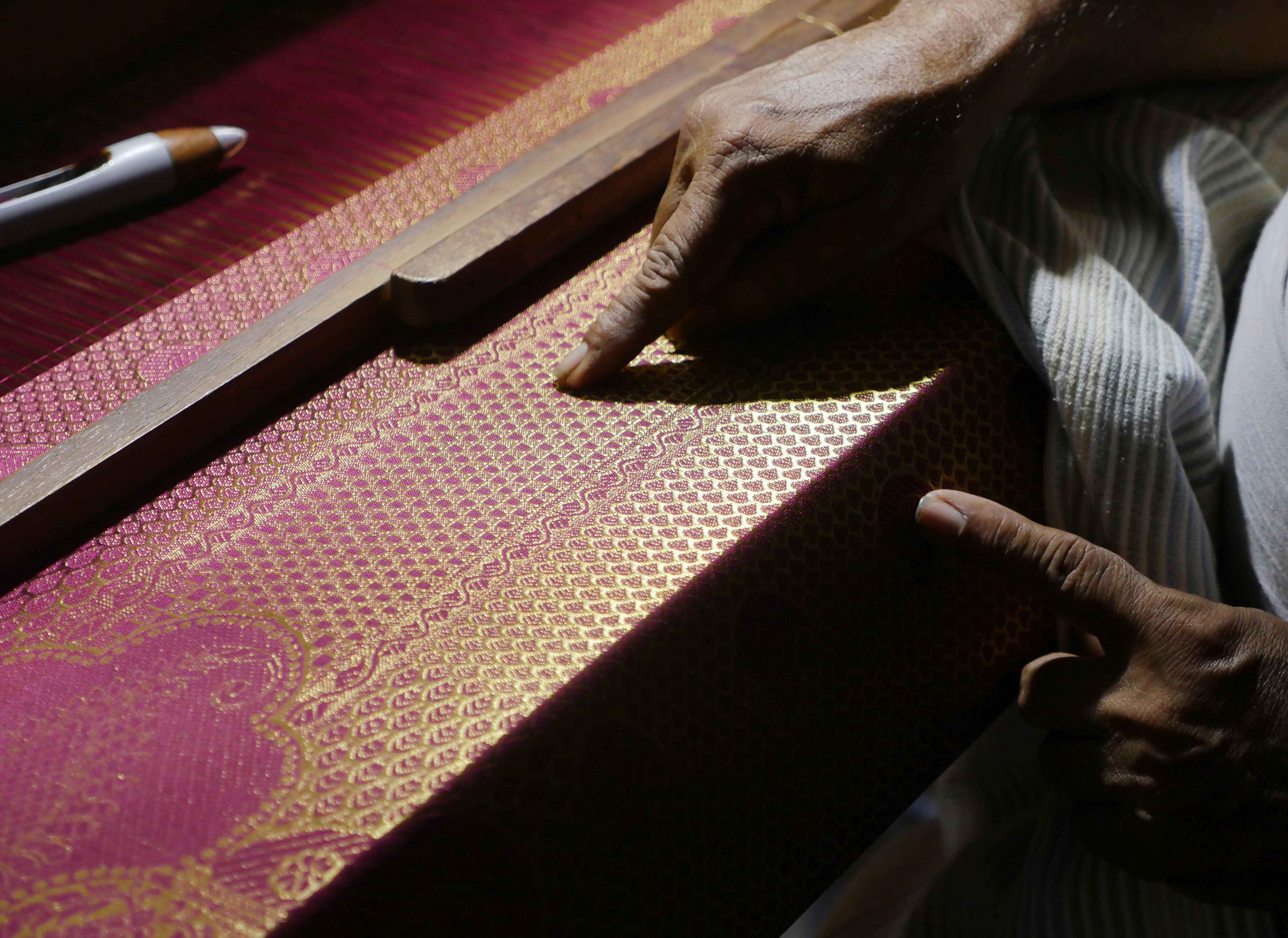 In the village of Thirbuvanam almost every house owns a handloom. On my last visit, I had the great pleasure of meeting Mr. Jothi, a master weaver. He explained, that the fine silk from the factory is too thick, so its manually split into three, producing an almost invisible thread, that is used to hand weave the most wonderful Saris, interwoven with artistic gold and silver patterns. This craft has been part of this region for generations. No wonder then, that these silk saris are considered among the finest in India.