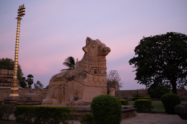The city is now in ruins, its massive granite blocks and those of the temple walls were used to build a dam to block the river for irrigation. Yet, Gangaikondacholisvarar is one of the most stunning temples in South India. Its outer walls are decorated with the most elaborate carvings depicting episodes from Shaivite mythology. The imposing Nandi statue in front of the temple was built to deflect the morning light into the inner shrine. Many of the beautiful sculptures were brought from Andhra Pradesh, Karnataka and Bengal as war trophies.